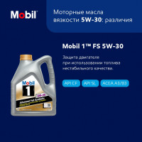 - Mobil 1™ FS 5W-30 защищает двигатель при использовании топлива нестабильного качества. Соответствует нормам API CF и API SL, ACEA A3/B3 и другим, имеет одобрение LADA, Renault.